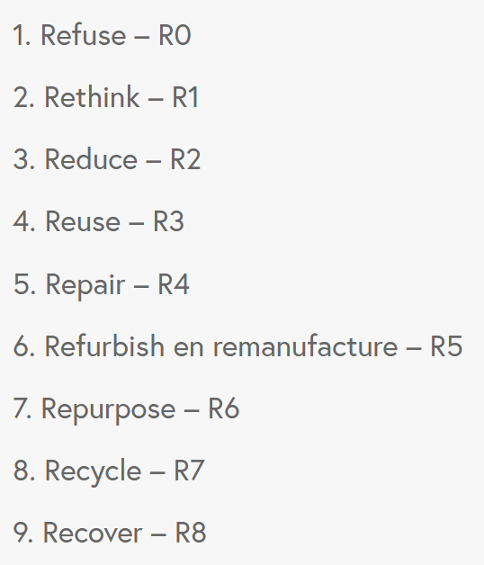 Bij Rijkdiensten (ook een R, maar dat terzijde), met name bij RVO, hebben ze het inzake circulariteit of andere duurzaamheidsaspecten over de R-ladder. Hoe hoger in de ladder, hoe minder grondstoffen gebruikt worden. Al dan niet met 6 R’en. Ook is de 'Ladder van Lansink', door de gelijknamige politicus Ad Lansink in 1979 in de 2e kamer geïntroduceerd. Misschien ook bij u bekend?